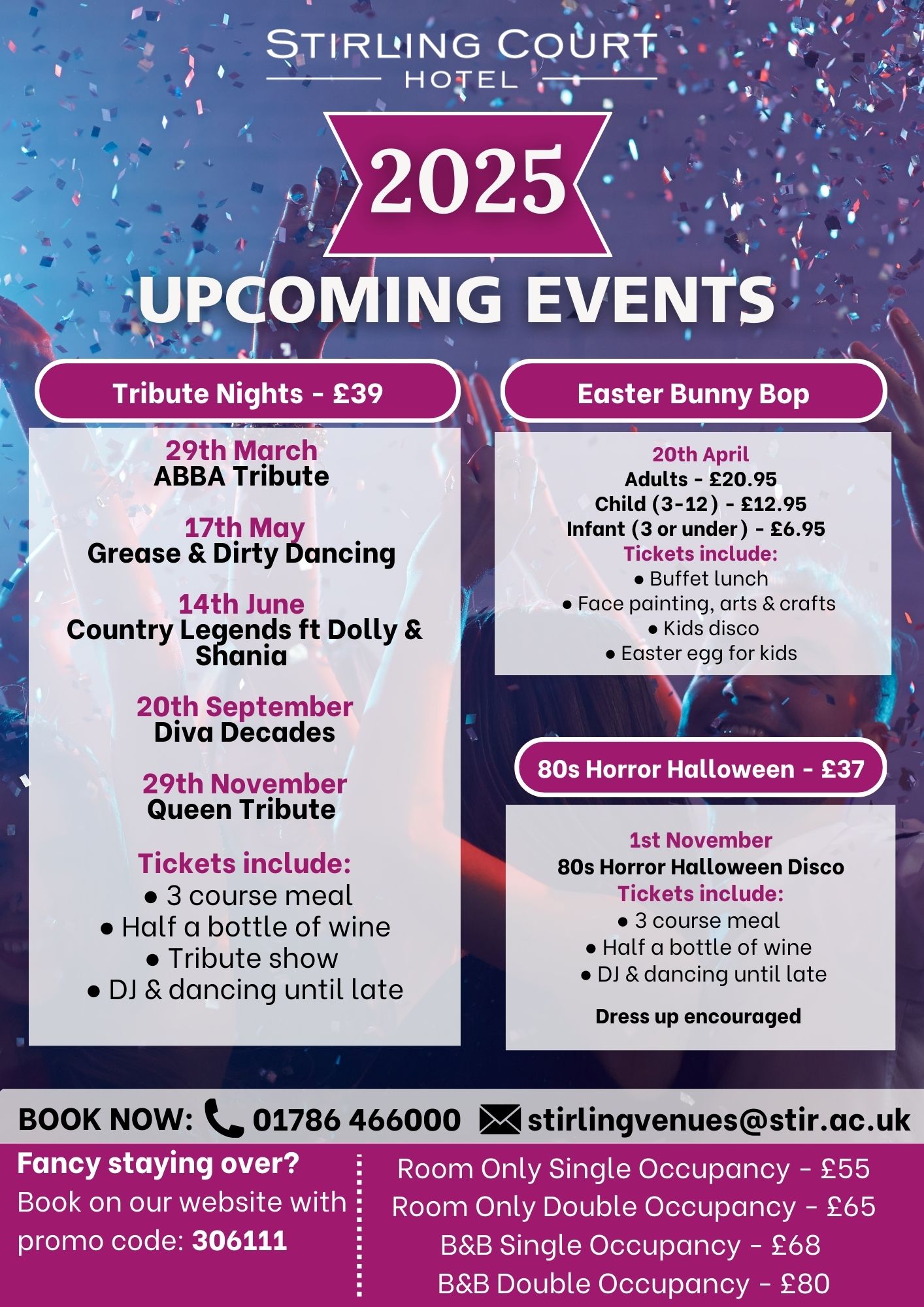 Stirling Court Hotel is renowned for throwing the best parties! Packed full of fun, fizz and fabulous entertainment, our events are a popular choice for crowds of friends, office nights out, hen parties, stag dos and just a great excuse for a good night out!